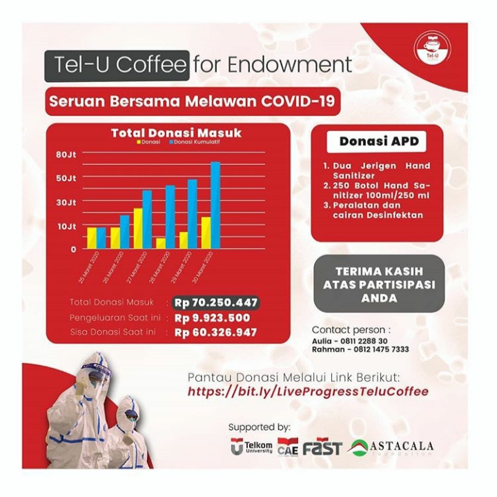 Direktorat Pengembangan Karir, Alumni dan Endowment melalui Tel-U Coffee bersama Forum Alumni Universitas Telkom (FAST) dan Yayasan Astacala menggalang donasi untuk bersama melawan COVID-19 yang saat ini semakin memprihatinkan.